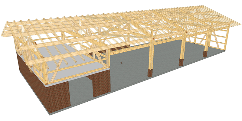 Planung und Fertigung von Dachstühlen, Carports, Pergolas, Holzterrassen mit Überdachung, freie Konstruktionen in Holz, Fachwerkwände (Tragkonstruktionen), Hallenbau, Wände mit Elementierungen.
